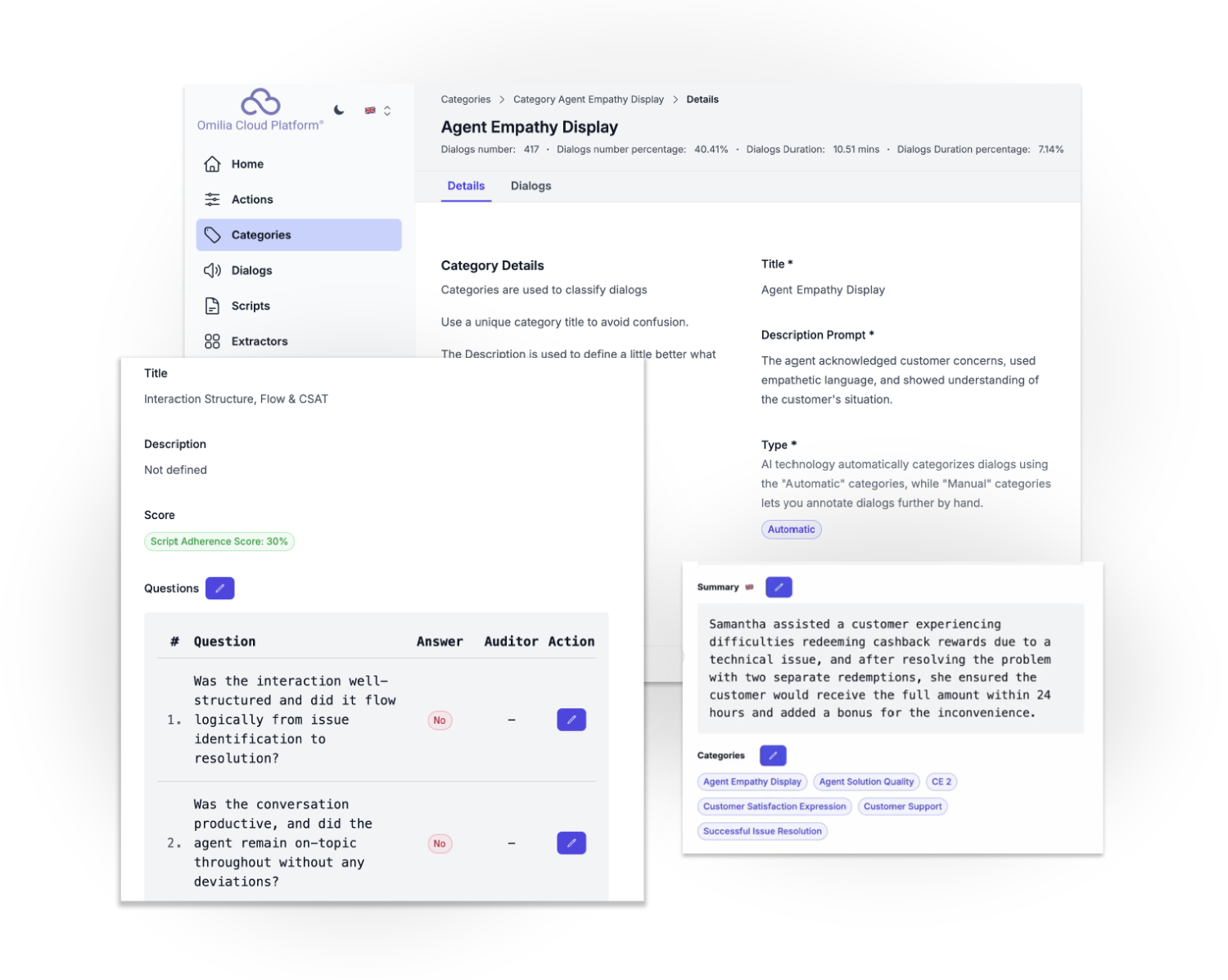 - Coverage & Analysis: Automated analysis of 100% of interactions across voice, chat and digital channels, both live and recorded, enabling full-funnel quality measurement and detection of issues at scale.