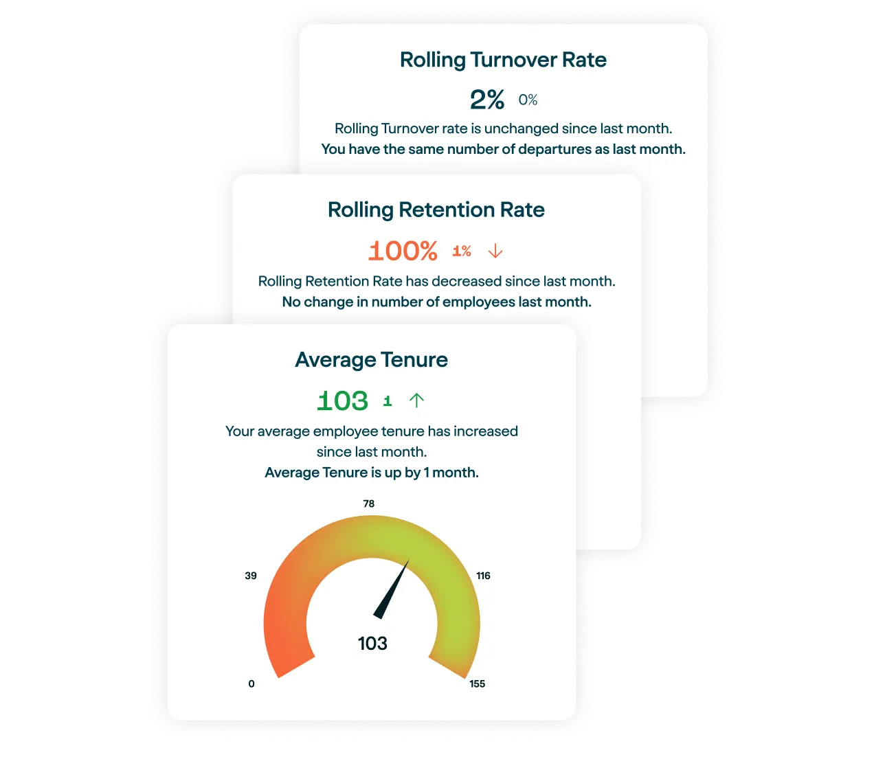 - Track workforce health with retention, tenure, and headcount metrics to guide staffing decisions.