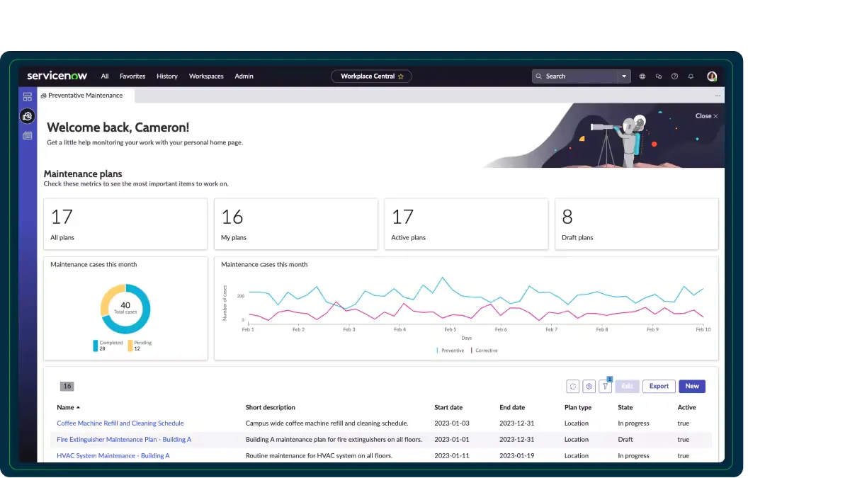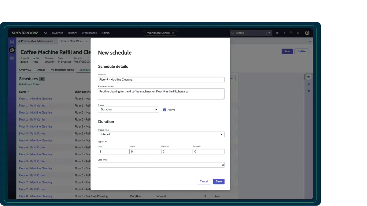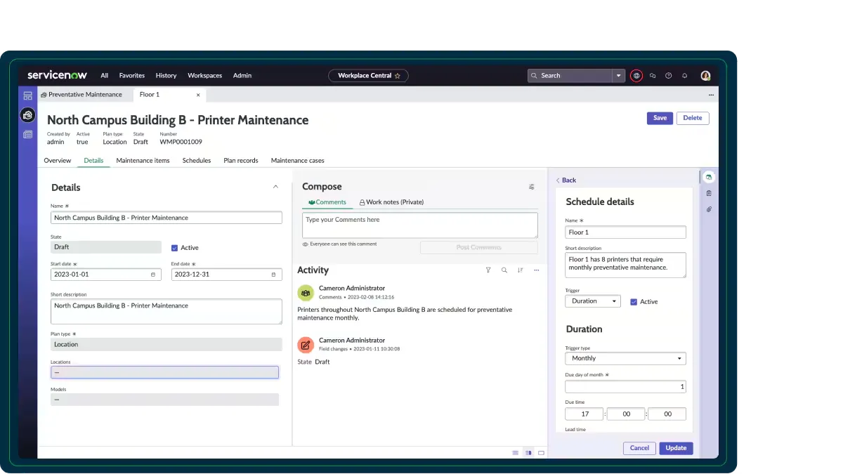 ServiceNow Workplace Maintenance Management is a software solution designed to streamline maintenance operations across multiple locations through centralized planning and automation. It provides tools for managing both corrective and preventive maintenance activities, integrating asset tracking with maintenance workflows.