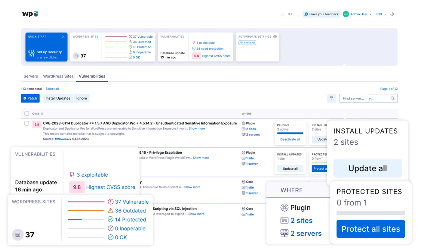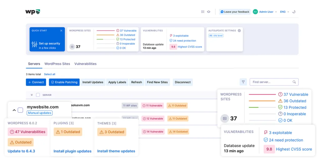 - Vulnerability Scans & Reporting: Automatically detect and report vulnerabilities across connected servers and WordPress sites.