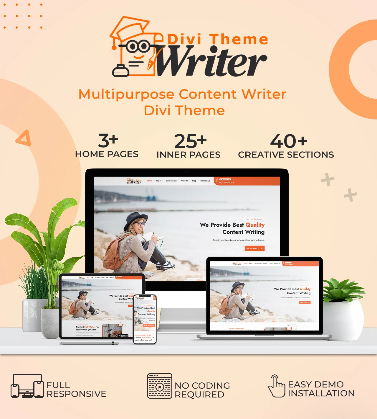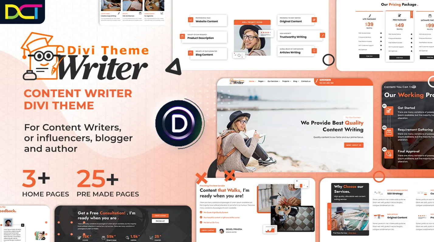 Multi Purpose 25 + Pr-Built Pages Best Writer Divi Content Writer Theme perfect for those who want to create a professional-looking WordPress-based website for Professional Content Writing Services, Copy writing Agency, Storytelling experts, Copywriter, Content Writer, Authors, or any writing services.