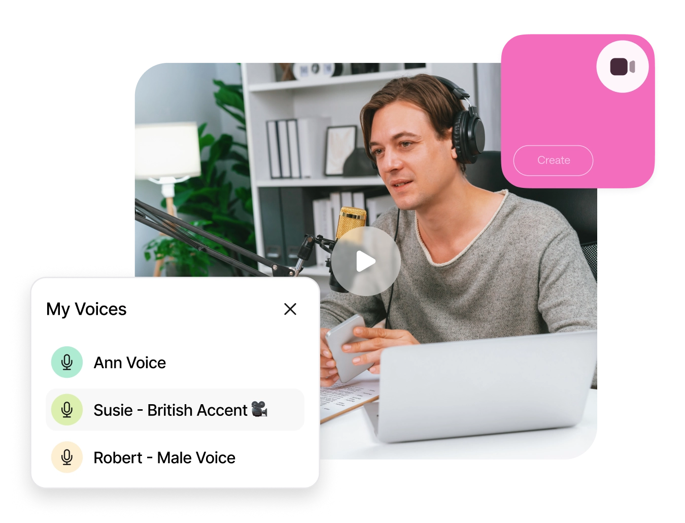 - Start Recording or AI-Voice: Record your own voice or use lifelike AI voices by simply typing your script.