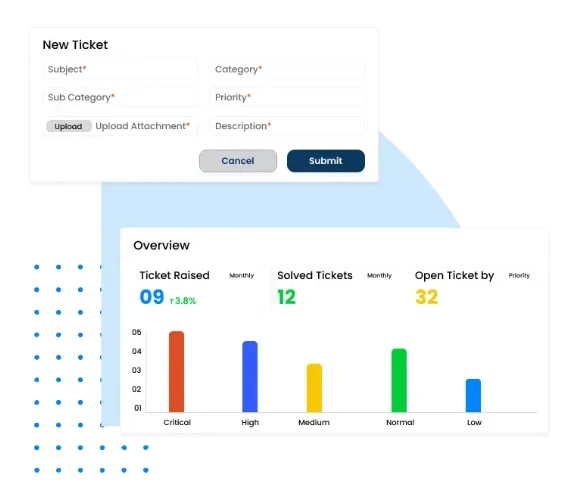 - Helpdesk Management: Unified ticketing system for employee queries, escalation levels, feedback tracking, and resolution analytics.